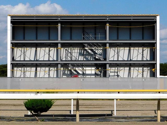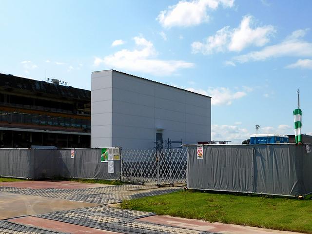 これまで水沢競馬場になかった大型映像装置の建設がついに開始され、今回お伺いした時には、ガワだけ出来ているという感感じでした。それにしても、装置の内側って、こんなふうになっていたんですね。