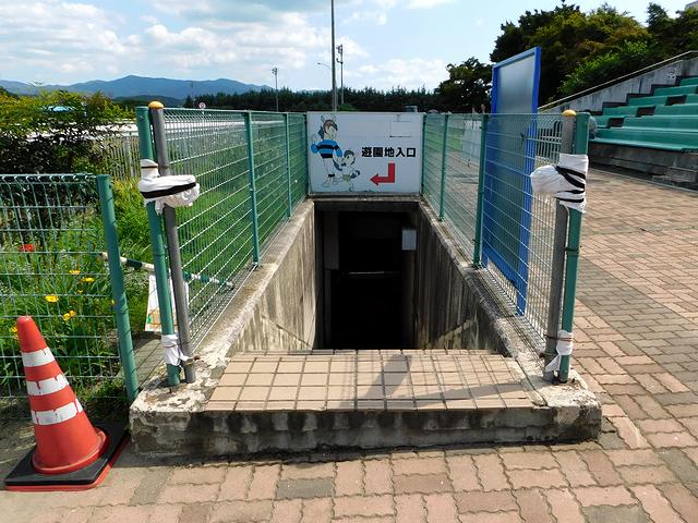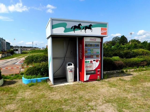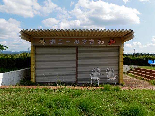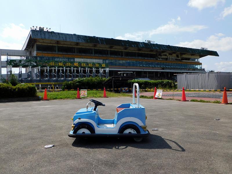 今回、水沢競馬場4度目の訪問にして初めて訪れたのが、馬場内にある「遊園地」。テレトラック前にある入口から馬場の下を通る地下通路を通って出た先は、水沢競馬場のかつての賑わいを想像させるノスタルジックな場所というと言い過ぎでしょうか。馬場内投票所は現在、ゲートの移動やセッティングなどで働く方の控え室となっているよう。あと売店跡は店名といいその両側に書かれたお馬さんのキャラクターといい、ちょっと切ない感じ。ただ、人工芝が敷き詰められた広場に設置されたフィールドアスレチックは立派で、自販機も稼働していました。
