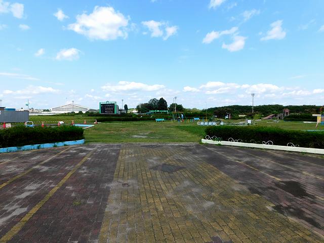 【遊園地の遊具とそこからスタンドを望む】