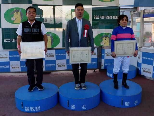 このレースの表彰式は、正門近くに作られたステージで。その際、岩手競馬のハンドタオルと共に、勝利した阿部英俊騎手のサインも配られたのですが、私がハンドタオル、同行の家人がサインをゲット!たいへん良い記念となりました。ありがとうございます!!
