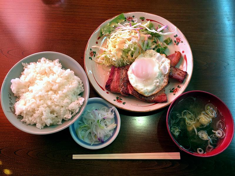 それで注文後まず登場したのが、今回のある意味メインというか、家人、そして私も長年謎に思っていた品。実はこちらのお店って、定食類やご飯物のメニューがとても豊富だったりするのですが、その中で、(焼肉定食などの分かり易い品名と違って)ベーコンで定食ということで名前から想像力をかき立てられることに加え、値段もこちらのお店で2番目に高額(焼肉定食などと同額)な品だったりするんです。で、ライス、味噌汁、お新香ときて、メインのお皿がテーブルに載せられると「成る程!そういうことか!」と即座に納得。ベーコンがメインのベーコンエッグなのですが、ベーコンは厚みが5mm以上有るものがゴロゴロという感じでした。で、ご飯の量も含めかなりボリューミーなので、食べきれない分が私に回ってきたのですが、焼かれたベーコンは黒コショウが効かされていて美味。また、味噌汁はワカメと豆腐、ネギと極めてスタンダートながらホっとするお味でした。