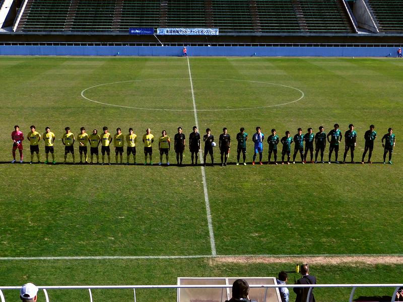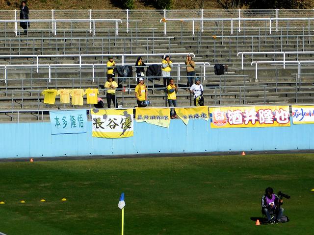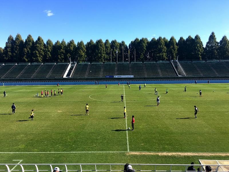 大会プログラムは昨日家人が購入していたので、この日はスルー。ですが、プログラムを売っていた県サッカー協会?の方に、バックスタンドに入場可能か聞いたところ、客席解放はメインスタンドとゴール裏のみで、バックスタンドは入場不可とのこと。実はグリスタって、午後になるとメインスタンドが日陰となってこの時期は大変寒くなるのですが、バックスタンドは終始日向なうえ、スタンドの角度がわりと急なお陰で最上段付近からの眺めが試合を観る上でとても都合良いんですよね。でも入れないものは仕方ない(実は試合開始後、バックスタンドに入って観戦していた人がいたのですが、途中で係の人に注意を受けたのか、その後居なくなっていました。)のでメインスタンド中央付近に席を確保。ちなみにメインスタンドも全面開放ではなく、通路を挟んで上半分は、関係者席になっているようでした。