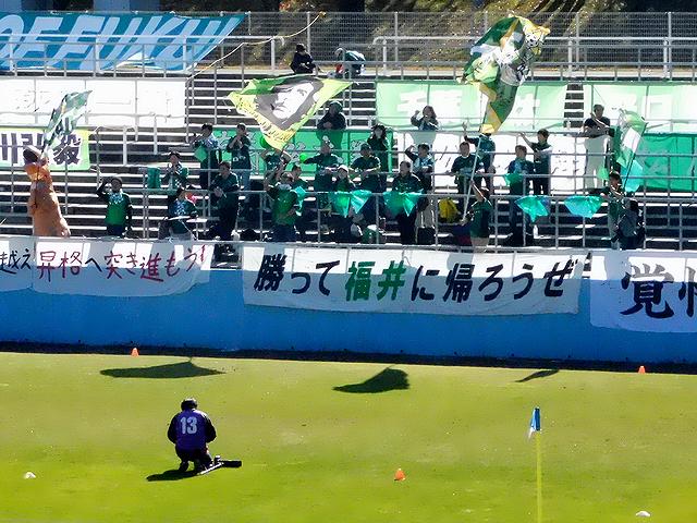 【遠路駆けつけた福井サポーター(左端に恐竜!)】