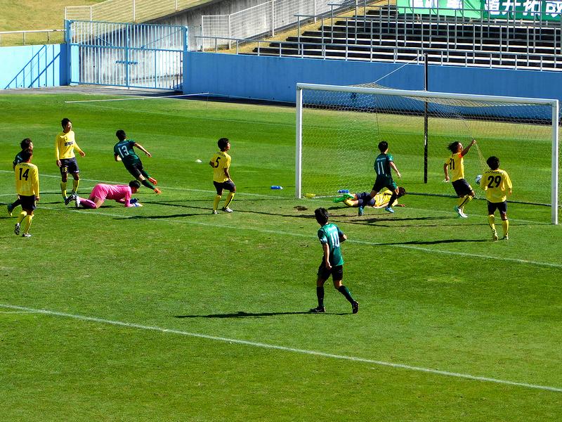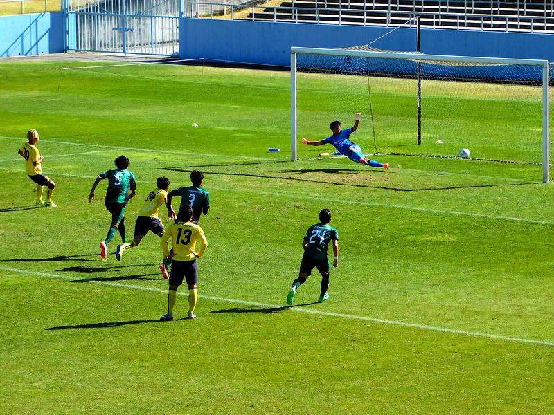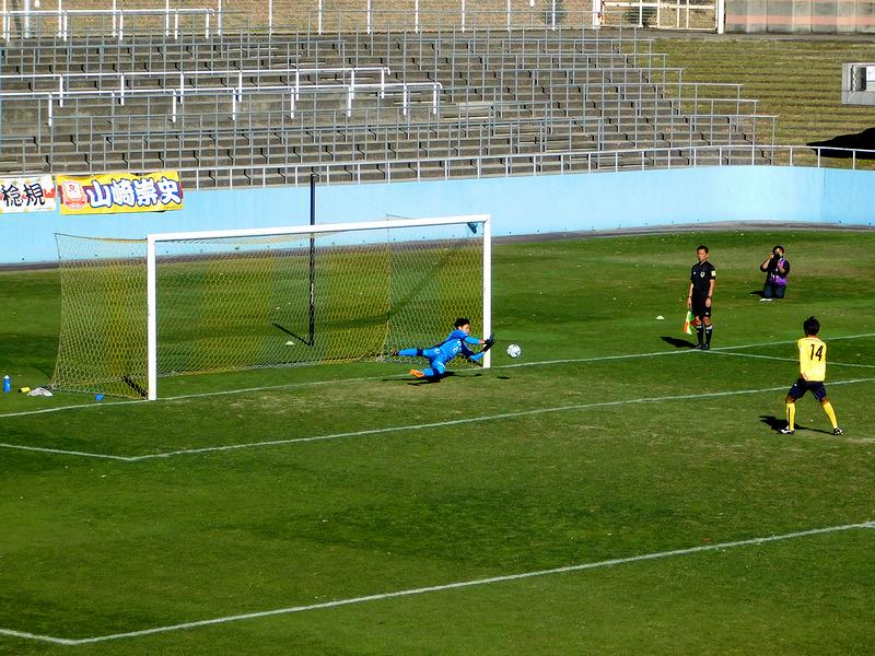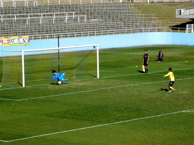 そんな両チームの試合なのですが、松江が引き気味というか、一度後ろにボールを送ってからの縦の攻めを行っていたのが印象的で、このような大会を勝ち抜くための戦術を徹底しているよう。福井はそんな松江にボールを持たせていたようにも見えました。で、ボールを持ってもシュートまで行くこともあまりなく迎えた前半43分。松江がPKを獲得すると、序盤から動きが目立っていたFWの金村選手(背番号39)が右足で決め先制。そのままハーフタイムを迎えました。そして後半。ハーフタイムで福井は前線の選手を一気に3人交替(ちなみに、選手交代は1試合5人まで可。)して攻勢に出ると、後半28分、その交替で入ったFW松尾選手(13)がゴールを決め同点に。ただ、ここからどちらも点数が入らないまま時間が過ぎていったのですが、アディショナルタイムに入って終了直前、福井は残っていた最後の交替枠でゴールキーパーを替えてきました。