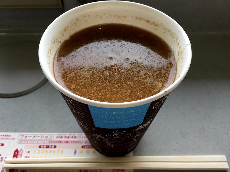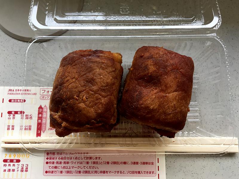 こちらは、今回競馬場でいただいた中で、一番インパクトのあった品。前述の牛串を買おうとした際、「ビーフジャーキーからスパイスを抜いて100倍濃縮したような牛のにおいがするなぁ」と思ったのですが、買った牛串は香ばしい香りがして???となっていたところ、その後、同行者のリクエストで購入しようとして、においの主はこちらだと判明。ただ、におい(と見た目)は強烈だったものの、お味の方は意外なほど落ち着いていたというか、味見させて貰ったところ、牛タンの旨味がしっかり出ているけど味そのものはしつこくなく、むしろシンプルで美味。あと、ものすごく熱々だったのも、曇り空で肌寒かったこの日には嬉しいところでした。
