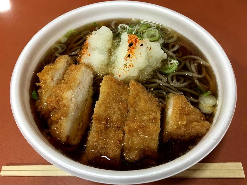 それで今回はどのそばをいただこうかと思ったのですが、以前見た時から気になっていたこちらの品を。で、自分で注文した品にも関わらず、その姿に思わず笑ってしまったというか。だって、トンカツ、しかもわりと立派な物が、(切ってあるとはいえ)ドドンと載っているんですもの。それにサービスの大根おろしを上限のスプーン3杯かけ、まずはツユからいってみたところ、個人的には朝イチといっても時刻は午前9時を回っていたせいか、既にちょっと煮込まれた昆布ような風味が。もっとも、大根おろしが馴染むと気にならないレベルなのですが。そしてソバは、若干柔らかめの食感。あと上に載ったトンカツですが、見た目どおりの結構な存在感でした。