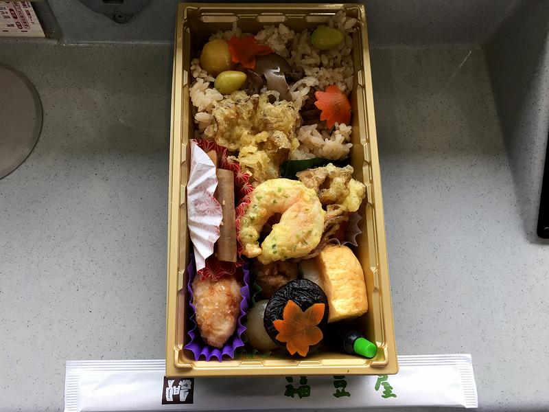 それで秋バージョンですが、夏バージョンと較べて、縦長になりました?で、包み紙に出馬表風に書かれた(これ、個人的にとても秀逸だと思います。)全12品のお品書きを見ると、主なものだけでも、シメジの炊き込みご飯、松茸を煮たもの、海老芋の揚げ出し、舞茸の天ぷら、海老の磯辺揚げ、鶏つくね、玉こんにゃくなど、今回もバラエティー豊か。そして包みを開けるとまず松茸が香り、紅葉形のニンジンや、ご飯に載った銀杏(個人的に大好物です。)が見た目にも秋を演出。それらに期待して一つ一つ味わってみると、今回もどれも良い塩梅ですねぇ。これは是非とも、春バージョンもいただいてみたくなりました。