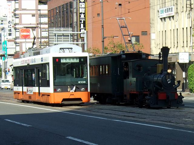 【坊ちゃん列車の回送列車とすれ違うモハ2100形電車(2106号、平成16年製)】