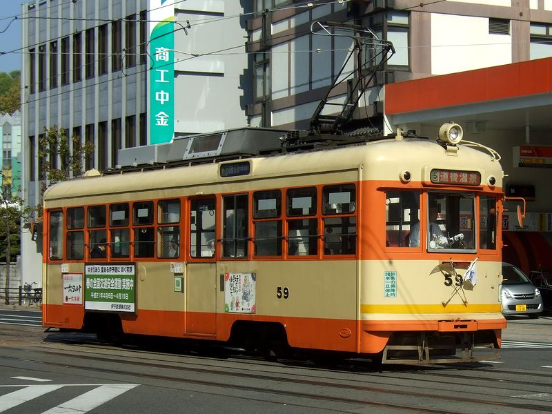 【大街道停留所に停車中の松山市駅行きモハ50形電車後期型2次車(66号、昭和37年製)】