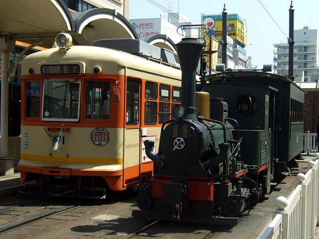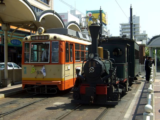 【モハ50形電車後期型2次車(66号、昭和37年製)と坊ちゃん列車(第2編成、平成14年デビュー)】