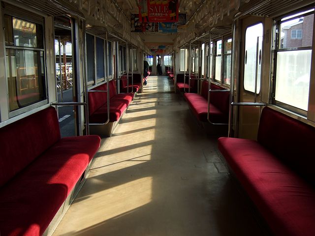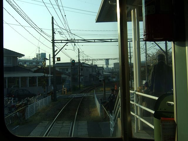その列車は、先頭車両の正面が2枚窓というちょっとレトロな外観の2両編成。後で調べたところ、元々は京王帝都電鉄で使われていた2010系という昭和37年製の車両(1962年8月東急車輛製造製のデハ2072)とのことで、車内もペンキ塗りの扉(新しめの車両はステンレス無塗装が多いかと)とかがちょっとレトロな雰囲気です。そういえば、私よりも年上の車両に乗るのって久しぶりかなって気がしたのですが、昨日と今日2回乗った松山市内線の66(形式はモハ50形というらしい)という車両も、後で調べたところ同じく昭和37年製造(アルナ工機製)のでした。