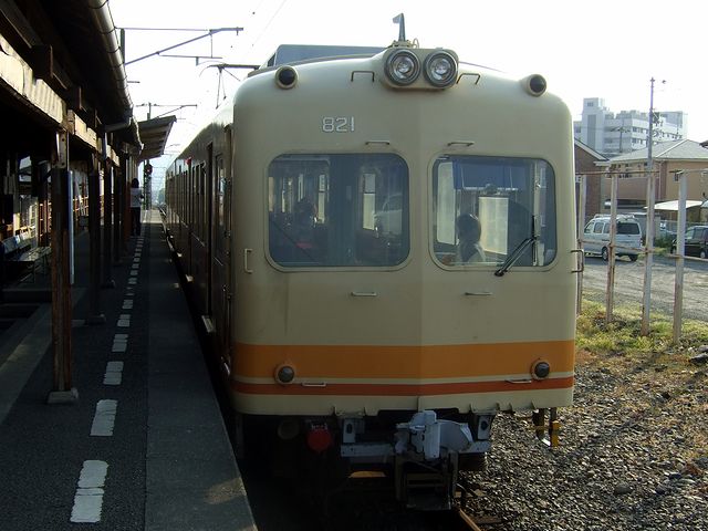 【横河原駅で発車を待つ高浜行き(最後尾となるモハ821側)】