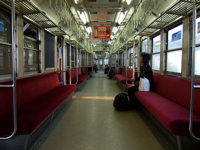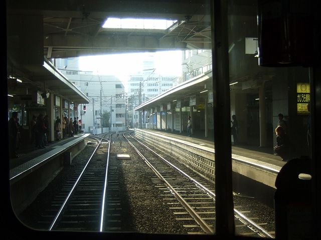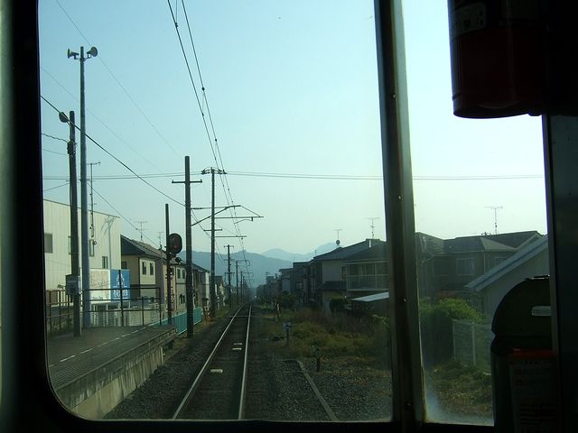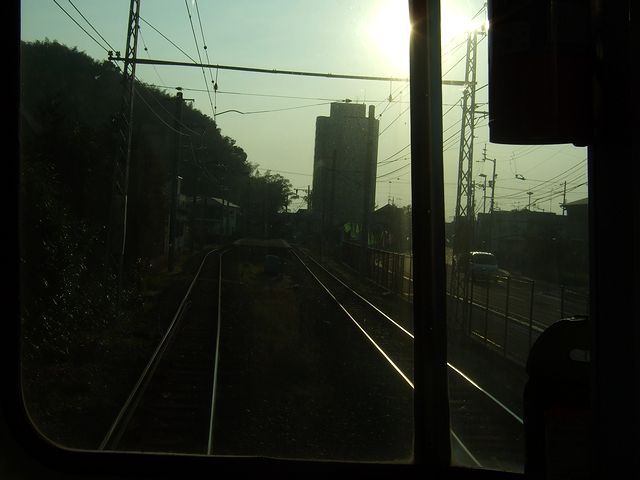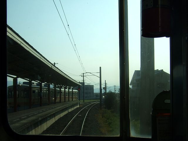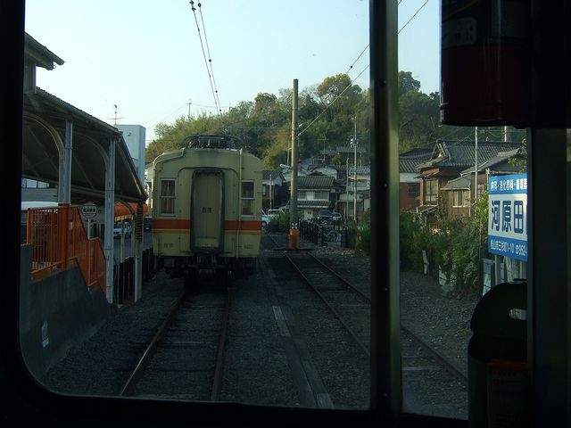 それで、列車は定刻に、立ってる乗客も多少出て松山市駅を発車。窓からは西日が差し込みますが、室内灯が消されている(地方の私鉄に乗ると、よくあるような気がしますが。)為、車内は薄暗く感じます。そして、単線の為ところどころで対向列車と交換しながら、郊外に向かって淡々と進んで、30分ほどで終点の横河原駅へ。その頃には、車内はだいぶ空いていました。