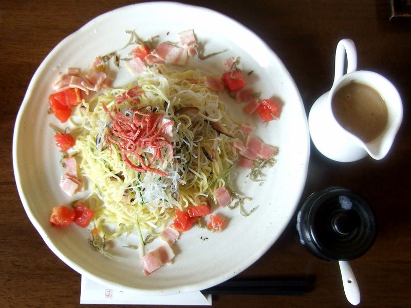で、今回いただいたのは、ふうふう涼麺(りゃんめん)と大根おろしそば。前回、前々回と気になっていたメニューなのですが、今回ようやく、という感じで。また、夏の限定メニューもいただいておかないと、そろそろ終わってしまうかなぁ、というのもあったもので。ちなみに、一人で二品いただいたのではなく、同行者とシェアしていただきました。