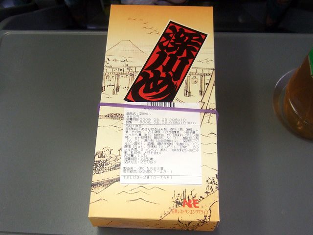 列車は定刻に発車すると、すぐさま品川に停車。そんな中、東京駅で購入したチキン弁当(好物)と崎陽軒のシウマイ(これも好物)で、(珍しく)昼間から一杯。ちなみに弁当はシェイアール東海パッセンジャーズ製のチキン弁当なのですが、オリジナルの日本食堂(って、今はNREか)のチキン弁当と較べると、からあげの味が2種類になっているなど進化?しているようです。