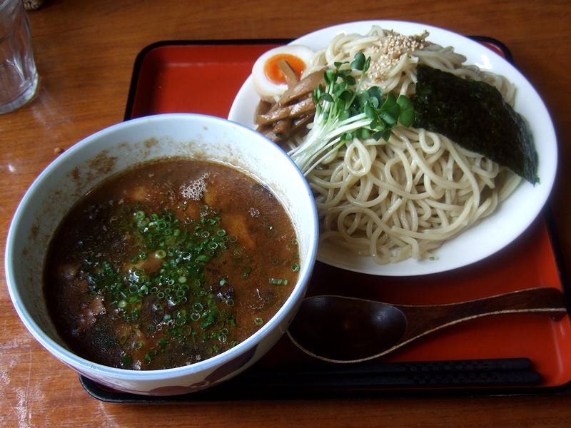 もっとも、冷やし中華の数量限定がないとは言っても、人気のお店のお昼時ですので、お店に着くと駐車場はほぼ満車で待ち客も数組ほど。しばらく待ってから席へと案内され注文となりますが、何を血迷ったのか、その特集の冷やし中華に加え、かねてより一度いただいてみたかったこちらのつけ麺(キノコと鶏肉)も一緒に注文。今回はその2品に加え同行者の注文した冷やし担々麺もあり、持ってくる順番を尋ねられたのですが、伸びる心配のあまりないメニューだったので、出来た順に持ってきていただくことにしました。