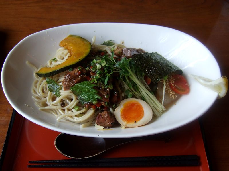 と、つけ麺をいただいていると、本日のメインというか元々のお目当てであるスパイシー塩冷やしが登場。つけ麺を味わうのは一時中断して早速。まず、全体を軽く混ぜてからいただいてみたところ、中太の麺は、つけ麺と同じ物でしょうか?それにスパイシーに調理されたコロコロのチャーシューや、鶏白湯スープの煮こごりなど絡んで、何とも複雑な味わい。よく見ると青じそが載っていたり、ごまやワケギなど和の薬味っぽい食材が使われているのですが、何ていうか、冷やし中華というよりも、冷製パスタというか、何だかとってもイタリアンな印象を受けました。また、途中から付属のレモンを搾ると、更にイタリアンというか西洋チックになって、これは、とっても面白い味ですねぇ。