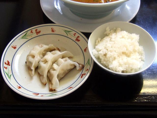 で、麺者黒嵐といえばもんみや8月号の冷やし中華特集にも載っていたので、実はその食べ歩きの第五弾としてお伺いしたのですが、注文時に店員さんにお伺いしたところ、残念ながらこの日はやっていないとのこと。しからば、お品書き(髭おやじの時と全く同じでした)に「当店限定」と書いてある特製辛みそラーメンの中盛りと、最近メニューに加わったらしい(お品書きにはなく店内のホワイトボードに書いてあった)ランチセットの(1)番(小ライス+半餃子)をお願い。店員さんが一人しかいないのでとても大変そうな中待つこと暫しで、まずはラーメンと、その後に半餃子、最後に小ライスが登場しました。