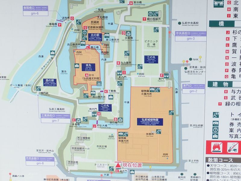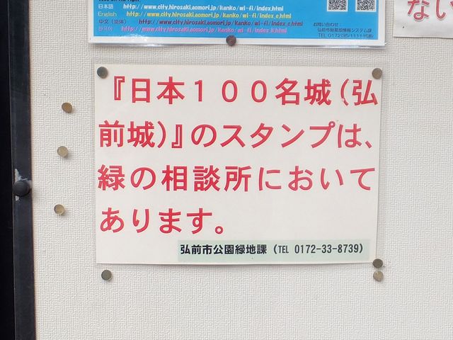 門を過ぎたところにあった城内の案内板を見たところ、「『日本100名城(弘前城)』のスタンプは、緑の相談所においてあります。」との貼り紙が。事前に調べた情報だと、確か、天守内の弘前城史料館にあった筈では。それで隣の案内図を見たところ、緑の相談所って、天守よりもちょっとばかり奥にあるなぁ、と、この時はそれくらいの認識でした。で、とりあえずは通りすがりに門とか櫓をチェックしつつ進むことにして、城の奥へ。それにしても、夏の終わりの夕暮れ時という時間帯も良かったのか、落ち着いて良い雰囲気の城内というか。