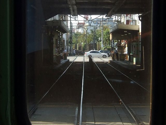 で、この列車でお隣の終点恵美須町停留所まで行くのですが、南霞町停留所を発車した列車は、ビルの谷間の薄暗い専用軌道を通って1分少々で終点に到着。その専用軌道は、当地で頻発した暴動の際に軌道敷のバラストが投石で使われるという理由でアスファルトをかぶせられていると聞いていましたが、南霞町駅付近以外は、普通にバラストむき出しでした。