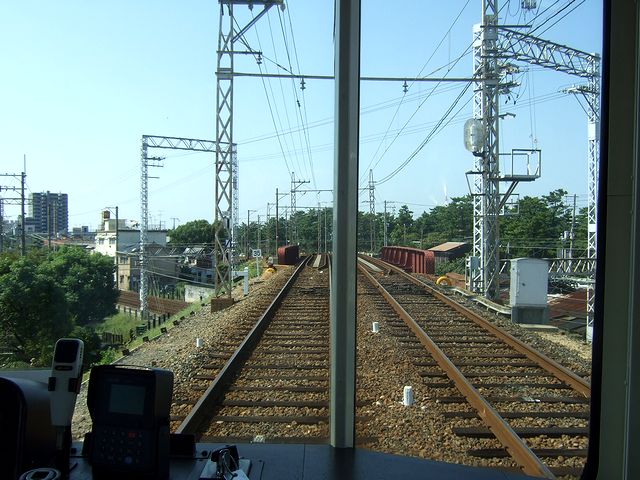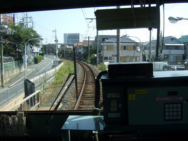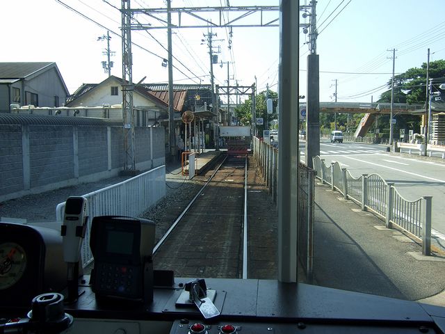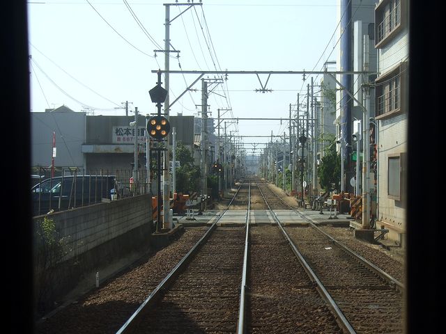 パラパラと乗客を乗せ恵美須町停留所を出発した列車は、暫くのあいだ専用軌道を走行。途中、盛り土で高架っぽくなっている区間があったりするのですが、基本的には線路が人の生活圏とものすごく近いというか、路地裏を走り抜ける感覚があります。途中、天神ノ森停留所を過ぎると併用軌道区間に。このあたりは、沿線にアパート・マンションが多いですね。そして、朝イチで乗った上町線と交差する住吉停留所を過ぎ、住吉大社に沿って走ると住吉鳥居停留所。まだ住吉大社は続き、それが過ぎると再び専用軌道に入って二駅ほど停まると、次がこの列車の終点の、我孫子道停留所でした。