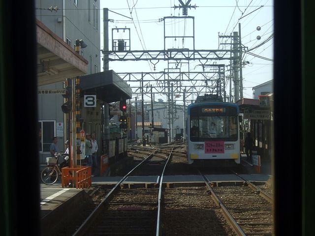 列車は車両基地の横を過ぎると築堤で高度を上げ、大和川鉄橋を渡ると大阪市から堺市へ。綾ノ町停留所から御陵前停留所の間はものすごく広い大道筋(紀州街道)という通りを走る併用軌道区間となるのですが、併用軌道とは言っても車道と軌道はグリーンベルトで分離され、半ば専用軌道のようです。また、沿線の風景は大阪市内とは変わって、都会ですが高いビルなどはあまり見られなくなるような。そこを抜け再び専用軌道に入り、石津川を渡り、その先で南海本線をオーバーパスすると、日本最古の公立公園である浜寺公園が見え、終点の浜寺駅前停留所に到着しました。