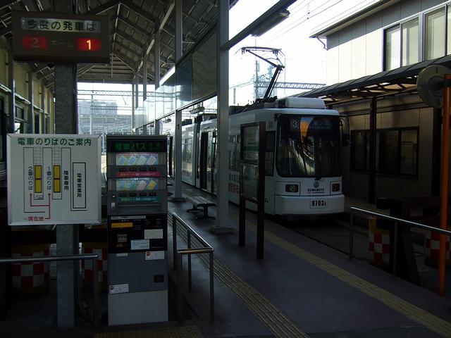また、この列車の車両は、日本で初めて導入(平成9年)された超低床路面電車である9700系で、以前乗った岡山電気軌道のMOMOの兄弟というか親戚(互いに主要機器等はドイツのアドトランツ社製の標準パーツを組み合わせたもの)だそう。で、この9703は、リース会社から熊本市交通局が15年契約でリースを受ける形で平成11年に導入されたそうです。