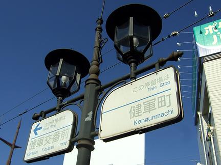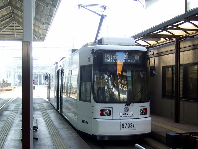 上熊本駅前電停で発車を待っていたのは、3系統健軍町行き。ちなみに熊本市電の運転系統は、上熊本電停から辛島町電停を通り健軍町に至るこの3系統の他、田崎橋電停から熊本駅前電停を経て、そして辛島町から3系統と同一の路線を走る2系統があるのですが、路線は、上熊本-辛島町が上熊本線、熊本駅前-辛島町-水道町が幹線、水道町-水前寺公園が水前寺線、水前寺公園-健軍町が健軍線、そして、熊本駅前-田崎橋が田崎線というふうに、実に5つに分かれているそうです。