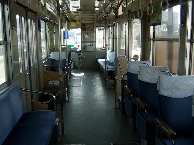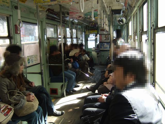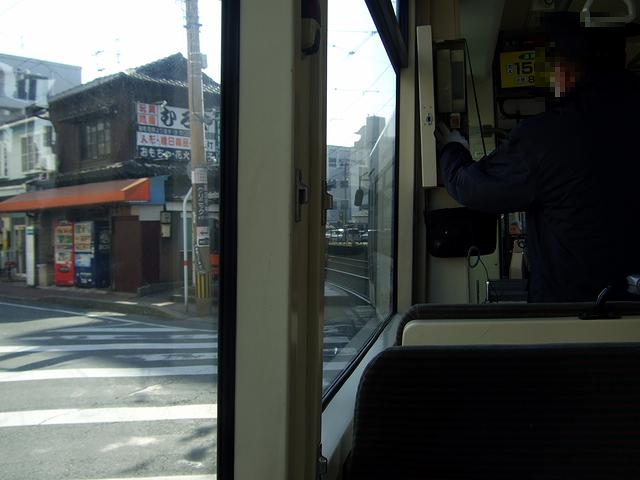 で、やってきたのは8500形という形式の車両。後で調べたところ、元々は昭和33~34年にかけて製造された1200形という車両の主要機器を流用し、8200形という車両に準じた車体を新造して昭和60~61年に製造された車両で、元になった1200形は路面電車として日本初の冷房装置付き車両(昭和58年に改造で搭載)、車体の元ネタの8200形が営業用車両として日本初のVVVFインバータ制御車(昭和57年)だそうです。 また車内には1人がけの転換クロスシートも装備され、その転換クロスシートを、折り返しの際に運転手さんがパタンパタンと一つ一つ向きを変えていました。
