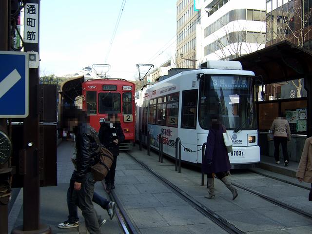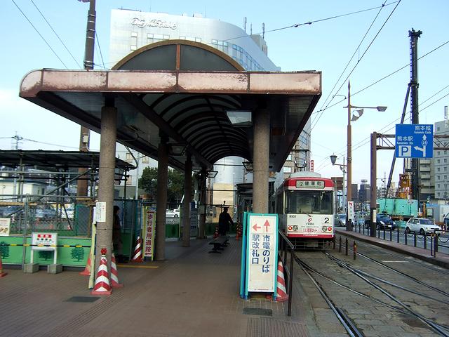 辛島町電停で幹線に合流し、左手に交通センターを見つつ進むと、熊本城前電停ではなく次の市役所前電停の先で熊本城をちょっとだけかすめて通町筋電停に到着。ここで、ちょっと途中下車してみようかと思います。