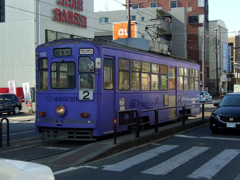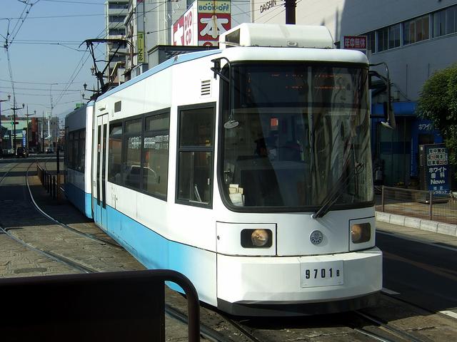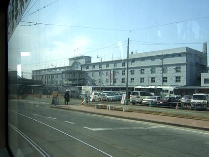 と、話が逸れましたが、列車はだんだんと市の中心部に向かって行き、途中の新町電停から洗馬橋電停の間は専用軌道を走行。ちなみに、洗馬橋は、童謡『あんたがたどこさ』に出てくる船場(の対岸)だそう。