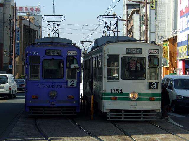 【健軍町電停にてその2 田崎橋に向かって去っていく1092と上熊本から到着した1354】