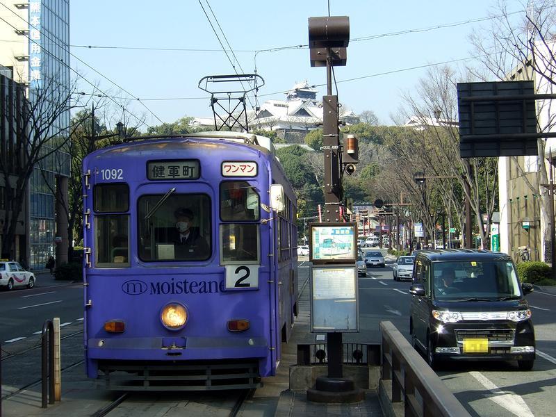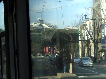 太平燕を堪能した後、再び通町筋電停に戻り、熊本市電の旅を再開。今度やってきたのは1090形という車両。後で調べたところによると、昭和30~32年製だそうです。で、その古色蒼然とした車両が、ちょうど熊本城をバックに走ってくる様は、何ともいいものがありますね。