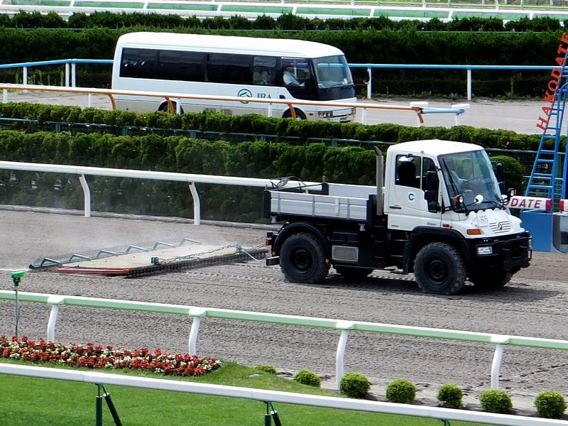ハロー掛けにはJRAではお馴染みのウニモグが。で、この車両ってナンバー付いてたんですね。
