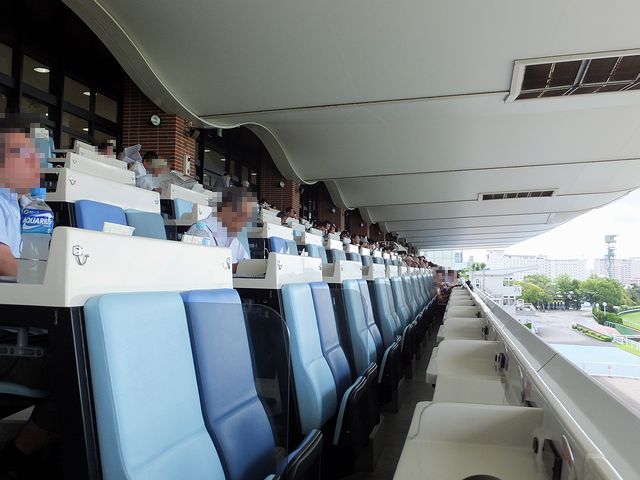 これが無料!と驚くパドックシート。椅子は良いし、(パドックには)大型モニターはあるし、(一部の)シートにはコンセントもあるらしいという。この日も大盛況でしたが、パークウインズの時など本当に便利そうですね。