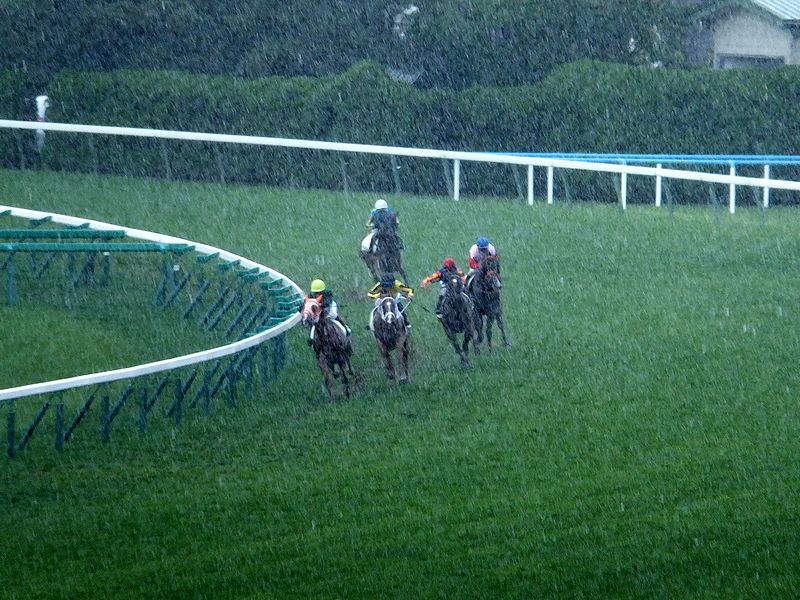 【驟雨の中4角を回る競走馬】
