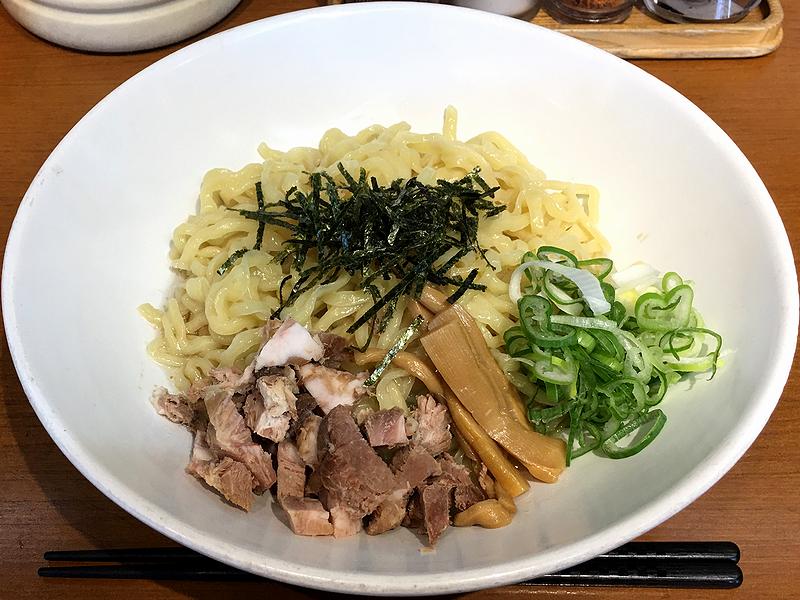 それで、こちらのつけ麺系のメニューよりは短い待ち時間で登場したのですが、早速お酢とラー油を投入。ちなみにこちらには、お酢が2種類あって、ノーマルなものの他ニンニク酢もあるのですが、最初はノーマルで。で、それらとタレ、油を麺によく混ぜてからいただくと、醤油ベースの味付けは濃く、油のコッテリ感もかなりある「ガツン」とくる味。これはこれでインパクトがあって良いと思うのですが、お品書きに書かれたお勧めのトッピングが生たまごというのもわかる気がします。また麺は、縮れの入ったやや平べったい中太タイプで、麺自体から個人的にちょっと苦手な過剰な粉臭さはなく、口当たりは柔らかいけどモチモチっとした食感が良いですね。そして具の、小さなサイコロ状に切られたチャーシューは「豚肉」が結構主張する感じ。もっとも、同様の印象は、昨日別の店でいただいた時も受けたので、油そばやまぜそばの場合、チャーシュースープに浸からない分、よりストレートにそのものの味を感じるのかもしれません。そして途中から、味変アイテムとしてニンニク酢を追加投入したところ、これは合いますね。
