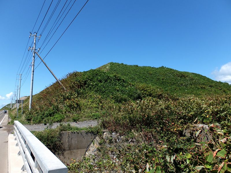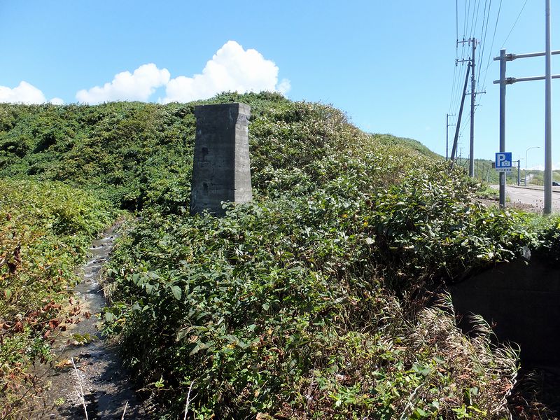 だんだんと気になって、クルマを停め調査。川には橋脚が残り、それらの前後にある海を見下ろす高台に、線路の跡っぽいカタチも。で、この時はわからなかったのですが、帰宅後に調べたところ、これらは松前線の未成(開業できなかった)区間なんですね。