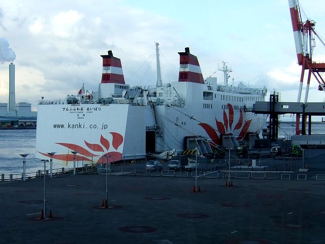 関西汽船のフェリーターミナルは、家族連れの観光客やら遠征帰りの体育会系高校・大学生などでかなりの混雑。とりあえず乗船手続きをしてそのターミナルで待つこと暫し。出港時刻の約1時間前の17:30頃乗船開始となったので、行列になって乗り込みました。