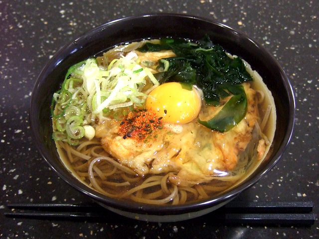 それでそのかき揚げそば。つゆの色はそれほど濃くはなかったんですが、塩気は結構強め。甘味も強くなく(かといって効いてないわけじゃないですが)、わりと硬派な味に感じました。個人的にはかき揚げにも生卵にも負けない塩気を持ったつゆって、好きですねぇ。またそばは、食感的に多分冷凍麺。そしてかき揚げはふわっとしたタイプ。つゆに溶解はしませんが、モソモソ感もなく、馴染みはいいと思います。