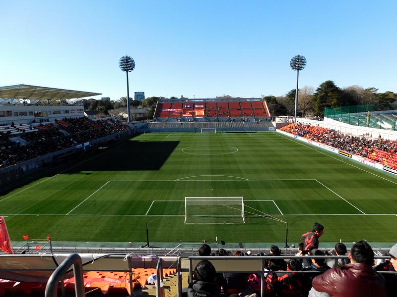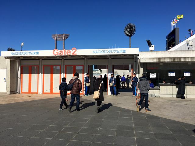 大宮駅から歩くこと20分少々。初詣で大混雑の氷川神社の脇を過ぎ、大宮公園の入口を過ぎれば、NACK5スタジアムの特徴的な照明、そしてそびえ立つホーム側のゴール裏スタンドが見えてきます。