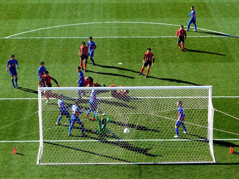 それで定刻の12時5分にキックオフ。ちなみに、高校サッカー選手権は、3回戦まで40分ハーフで行われます。