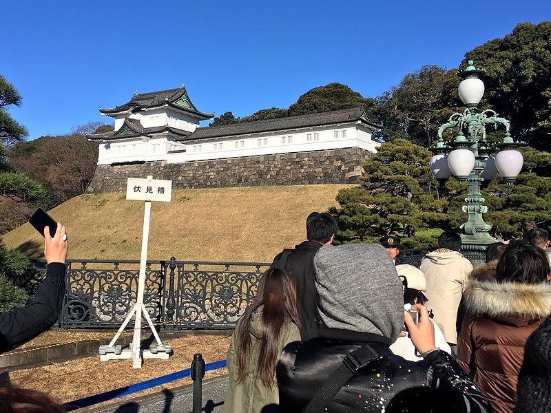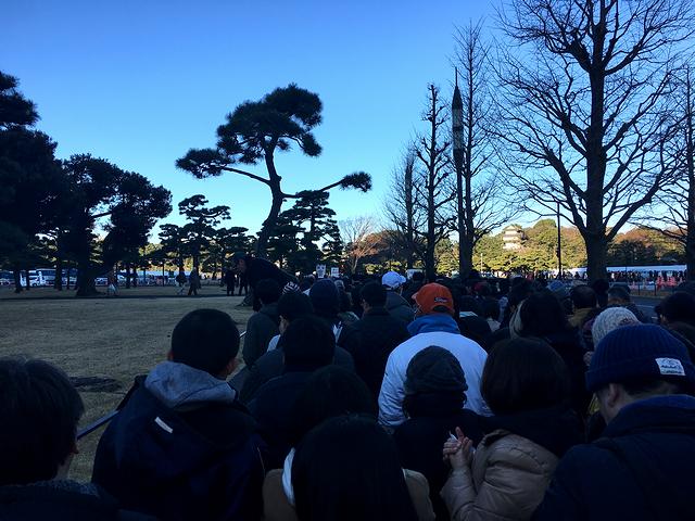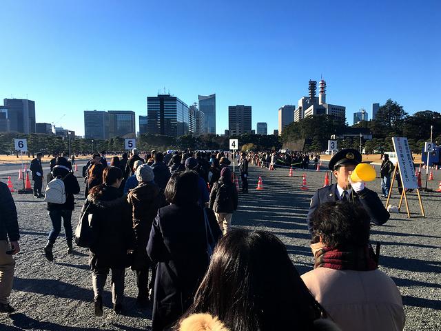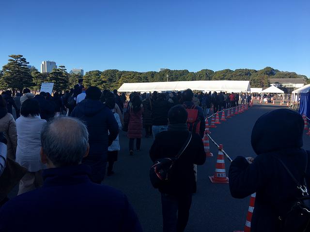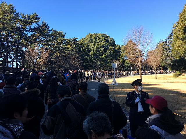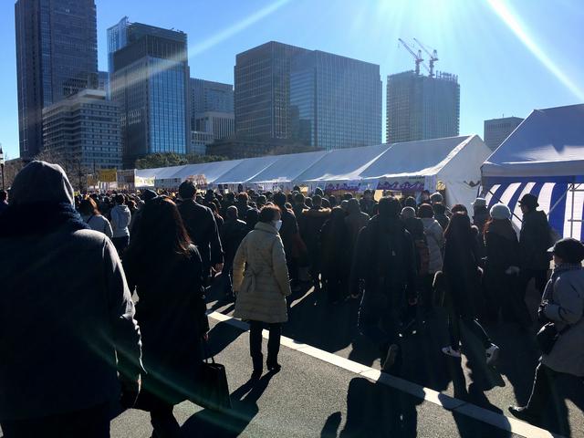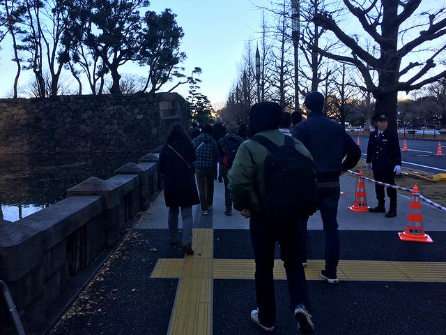 東京駅で下車したら、構内でトイレを済ませた後、丸の内地下中央口より行幸地下通路を通って皇居へと向かったのですが、ここでいくつか失敗を。まずは、何となく日比谷通り手前(東京駅寄り)の7番出口(Googleマップだと7と書かれている出口)から出てしまったのですが、丁度箱根駅伝の交通規制と重なってしまい日比谷通りが横断出来ず。まさかこんなにバッチリなタイミングで出くわすとは思っていなかったというか。(我が家は、箱根駅伝は毎年見ない家庭なもので。)そして次に、日比谷通りを渡ったD2出口(GoogleマップだとD2と書かれている出口)から出るも、近くに居た警察官によると一般参賀はこの出口ではなく向こう側の出口からとの案内が。それでようやく、正しい6番出口(Googleマップだと6と書かれている出口)から出ることが出来たのですが、これだけで結構なタイムロスというか、午前8時を回ってしまい、出口から出ると程なくして、皇居から続く行列の最後尾に付くこととなりました。それで、ここで不安になってきたのが、第1度目のお出ましに間に合うかどうか。この日、天皇皇后両陛下はじめ皇族の皆様のお出ましは、第1回目が午前10時10分頃、以下、午前11時00分頃、午前11時50分頃、午後1時30分頃、午後2時20分頃の計5回が予定されていたのですが、第1回目に間に合わないと、サッカーのキックオフにも間に合わない事になるんですよね。もっとも、私も家人もこの日第一の目的は新年一般参賀なので、もしそうなった場合はサッカーを諦めることになっていたのですが。