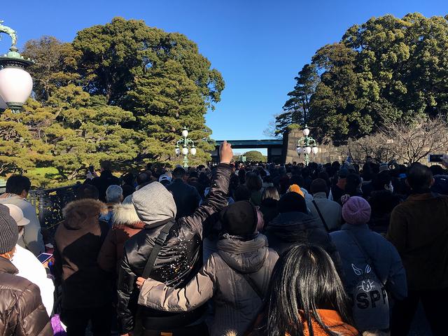 正門鉄橋(二重橋)を渡ってもう1つの正門?を潜れば、何度もテレビなどで見た宮殿前の広場に到着。ここも立ち止まらず、広場内の警察官の案内によって、天皇皇后両陛下はじめ皇族の皆様がお出ましになるテラスを囲むように詰めて立って待つことに。ここまで来れば、第1回目のお出ましに間に合いますね。それにしても、宮殿前で警備に当たる皇宮護衛官の皆様の、ビシっとした格好良さったら。それと、我々群衆の中にも制服警官の方が適宜配置され、やはりここは、もの凄く特別な場所ということを実感します。