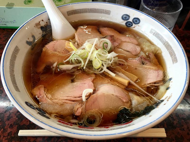 それで程なくして登場したこちらの品。早速スープからいってみたところ、鶏の旨味を感じさせつつも、クリアーな味わい。鶏の油は焔さんよりもかなり控えめに感じられ、そのかわりに醤油っ気と塩気がビシっと芯を1本通しているように思いました。また麺は、焔さんを思わせるというか、こちらがオリジナルな、ポコポコとしたエアリーな口当たりで、その食感は固すぎず柔らかすぎず、まさしく丁度良いというか。そして具のチャーシューは、店外で待っている間に感じていたとおり、スモーキーな風味が堪らず、その食感は肉感保ちつつ柔らかというのがどストライク。ほんと、チャーシューたっぷりの品にして良かったなぁ、と。それとワンタンのピロピロ感や小さいながら存在感のある餡も良い感じです。