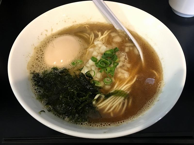 そんな中からチョイスしたのは、SRS醤油味に煮卵OPTIONを加えて。1号店さん同様、背が高く下がすぼまった器で登場したのですが、早速濁りのあるスープからいってみたところ、初手からガツンと「海」。鯛スープ+煮干しの組み合わせは、風味や旨味的に何て言うか、かなり魚魚する気がするのですが、さらにそこに、具のアオサが磯の風味を加えて、海無し県の栃木らしからぬ「海」を感じたというか。また、風味・旨味共に濃い出汁に合わせてか、醤油ベースの味着けも濃い目で、一口いただいただけでバシっと目が覚めていく気がします。そして、それに合わせる麺は、細目のストレートタイプ。硬質な食感がスープと良く合っています。そこに、薬味的に入った刻み生タマネギの清涼感と甘味が合うというか、これなら玉ネギUPしても良かったかもしれませんね。あと、OPTIONの味玉は、白身柔らか黄身トロトロとなっています。