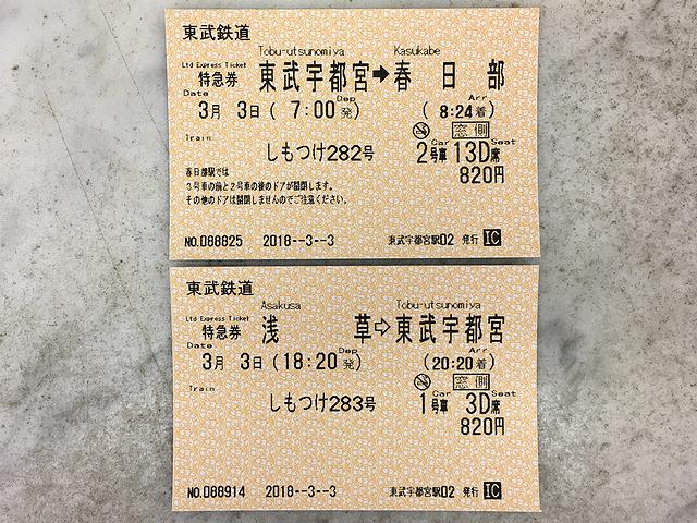 まず、東武宇都宮駅の改札前コンコースに置かれた自動券売機で、行きの分と、ついでに帰りの分まで特急券を購入。その券売機は、座席は窓側か通路側のみ選べ、シートマップからは選択できないタイプでした。あと、春日部駅で降りる行きの特急券には、券面に春日部駅では3号車の前部と2号車後部のドアしか開かない旨の注意書きが。ちなみに、特急料金は東武宇都宮駅から春日部駅、浅草駅から東武宇都宮駅の両方とも820円でした。