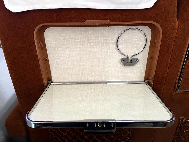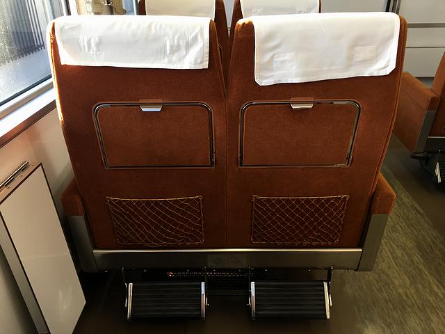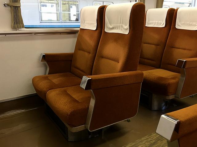 で、まだ他のお客さんが乗ってこないうちに今のうちに写真をパシャパシャと撮って(ちなみに今日の写真は全てiPhone6S+で撮りました。)から、指定された2号車の13D席へとついたのですが、進行方向左側、っていうか朝日をもろに浴びる東側ということで相当まぶしそうです。またそのシートは、今や貴重品と思われるリクライニングしない回転クロスシートで、背面のテーブルやフットレストなどのディテールが泣かせますね。加えて、古い車両にありがちな前のシート下に足を入れられないタイプなので、実際の間隔(シートピッチは960mm。)より若干狭く感じられますが、これも味ということで。あと、1号車と4号車にはトイレと自動販売機が設置されているのですが、この350系の種車となった1800系は、日本で初めて列車内に自動販売機を設置した車両とのことです。