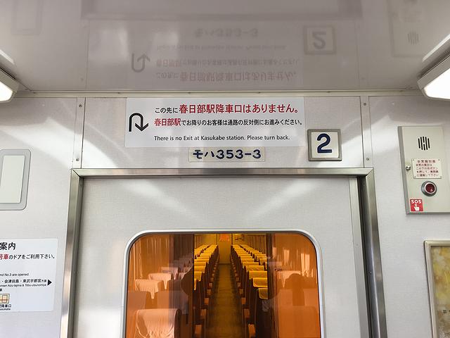 その車両基地を過ぎ、次の幸手駅を通過する辺りから車窓の街並みは途切れずに進み、やがて伊勢崎線と合流する東武動物公園駅をゆっくりと通過。この先は路線に東武スカイツリーラインという愛称が付きます。そして、結構手前から減速するんだなと思ったら未だ北春日部駅で、それを通過後、定刻8時27分、春日部駅に到着。10人程度乗っていた2号車からは、私を含め3人が降りました。で、降りる時に気がついたのですが、春日部駅で開くドアの数が制限されるのは、乗車時に特急券を確認するからなんですね。