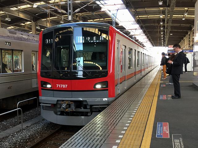 後続の普通列車は、東京メトロ日比谷線直通の中目黒行き。車両は昨年デビューした(東武)70000系という車両の7両編成なのですが、内装などはまだピカピカですね。それで中央部の車両は立ち客が出る程度の混み具合だったのですが、次の新越谷駅で席が空いたので、有り難く座らせて貰います。